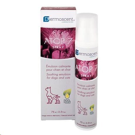 Formulated with 100%% natural active ingredients and a physiological pH, ATOP 7® Spray is a soothing and hydrating patented emulsion for irritated or allergy-prone skin in dogs and cats. ATOP 7® Spray soothes the skin of the animal, by supporting the barrier function of the skin. It helps to restore the hydrolipid film and to combat the hypersensitivity of irritated skins. Its submicronic texture (particles between 0.1 and 0.4 µm) allows immediate absorption at the level of the epidermis and a sustainable activity over several hours. Thanks to the formation of a protective film, which is invisible and non-occlusive, the product acts as a «second skin». ATOP 7® Spray is steroid-free, which allows a possible frequent use and an optimal skin tolerance.