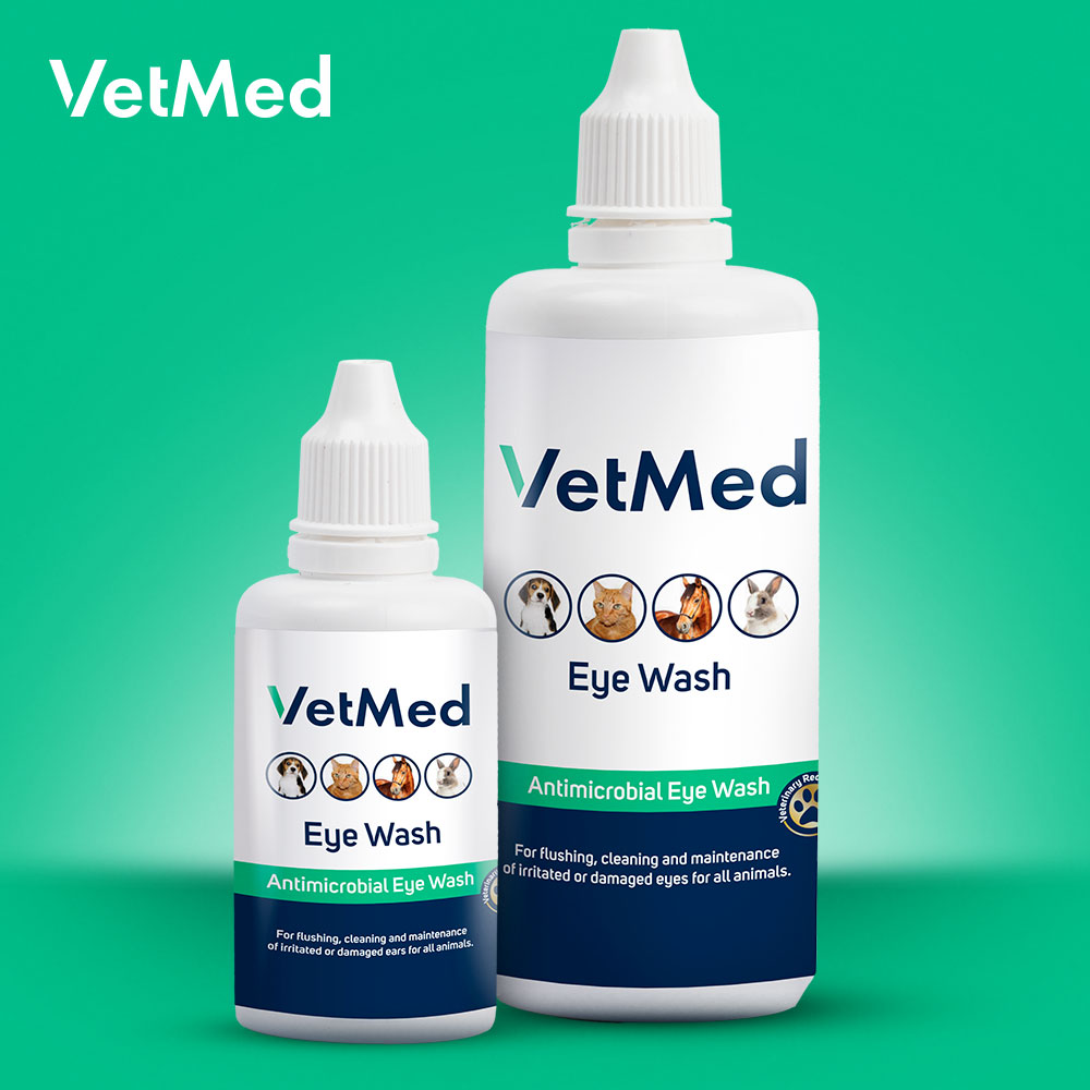Antimicrobial Eye Wash 50ml & 100ml For flushing, cleaning and maintenance of irritated or damaged eyes for all animals. Highly Effective and Safe for daily use VetMed Eye Wash is a unique non-stinging and soothing formulation that assists in the rinsing of dirt and debris, allergy relief for irritants such as mucous and pollen, reduce irritations such as burning or stinging as well as the cleaning of tear stains, restoring the fur surrounding the eye back to its natural orginal colour.
