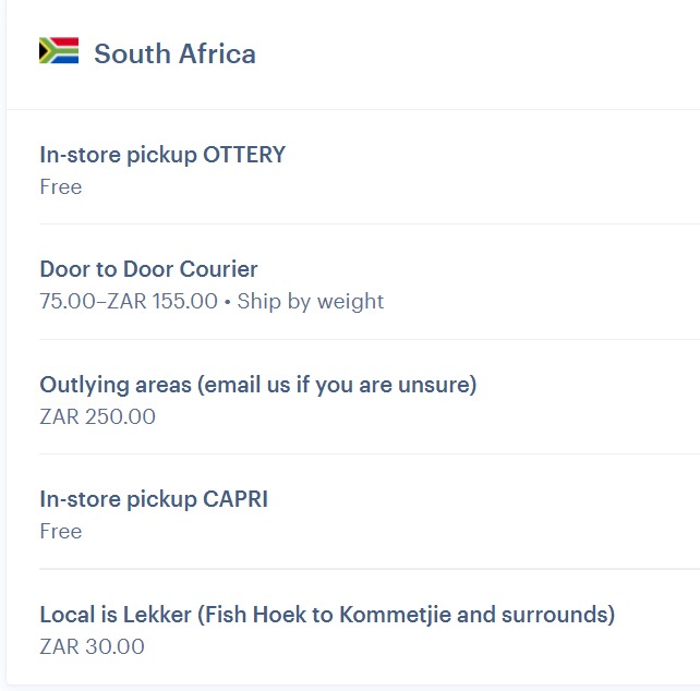 We only ship parcels to addresses within our South African borders. Please ensure that you include your FULL ADDRESS - including suburb and correct area code. Please ensure that you state any special instructions for the delivery of your parcel during the check out process ie: courier to press #8 on keypad.